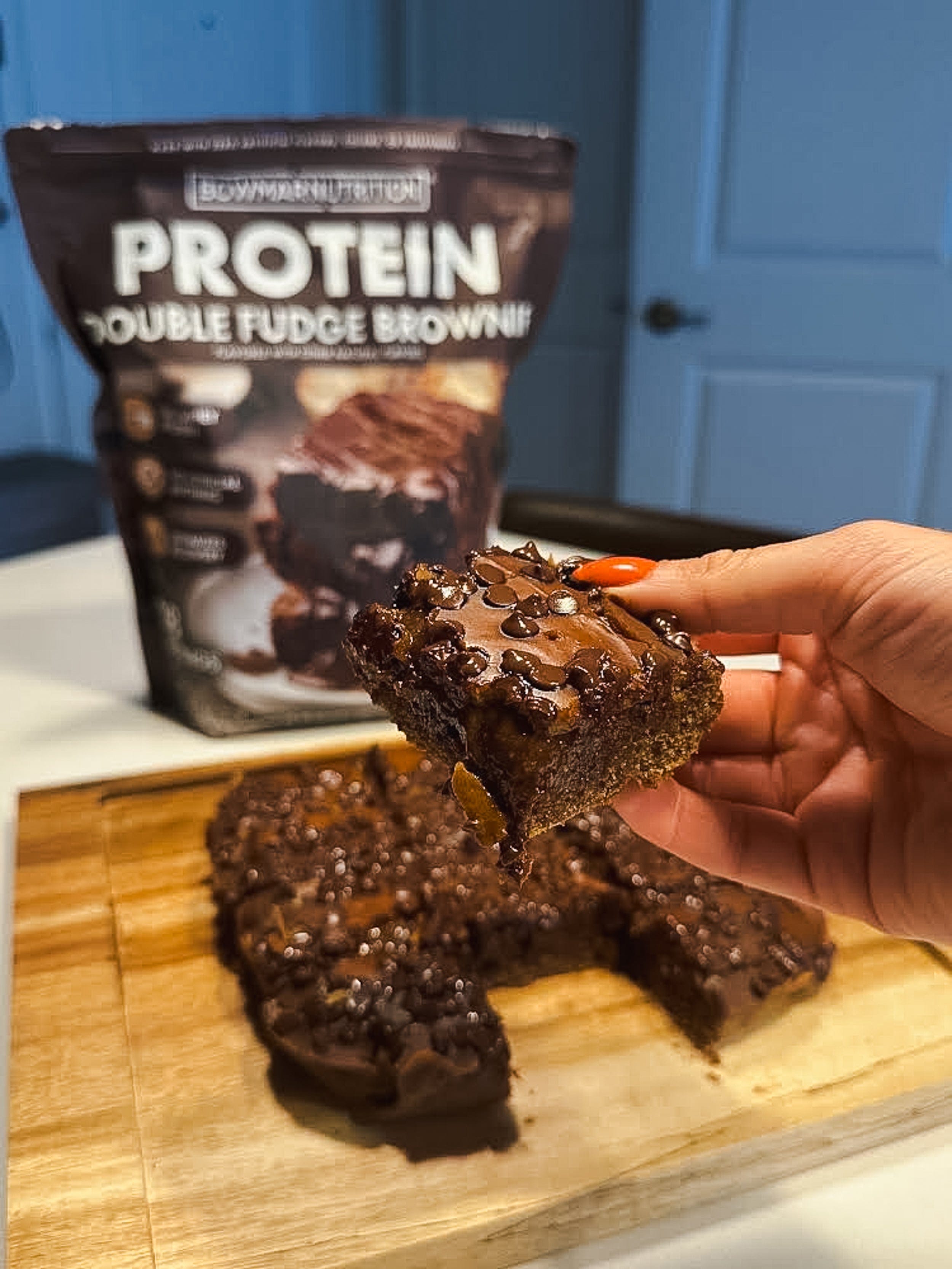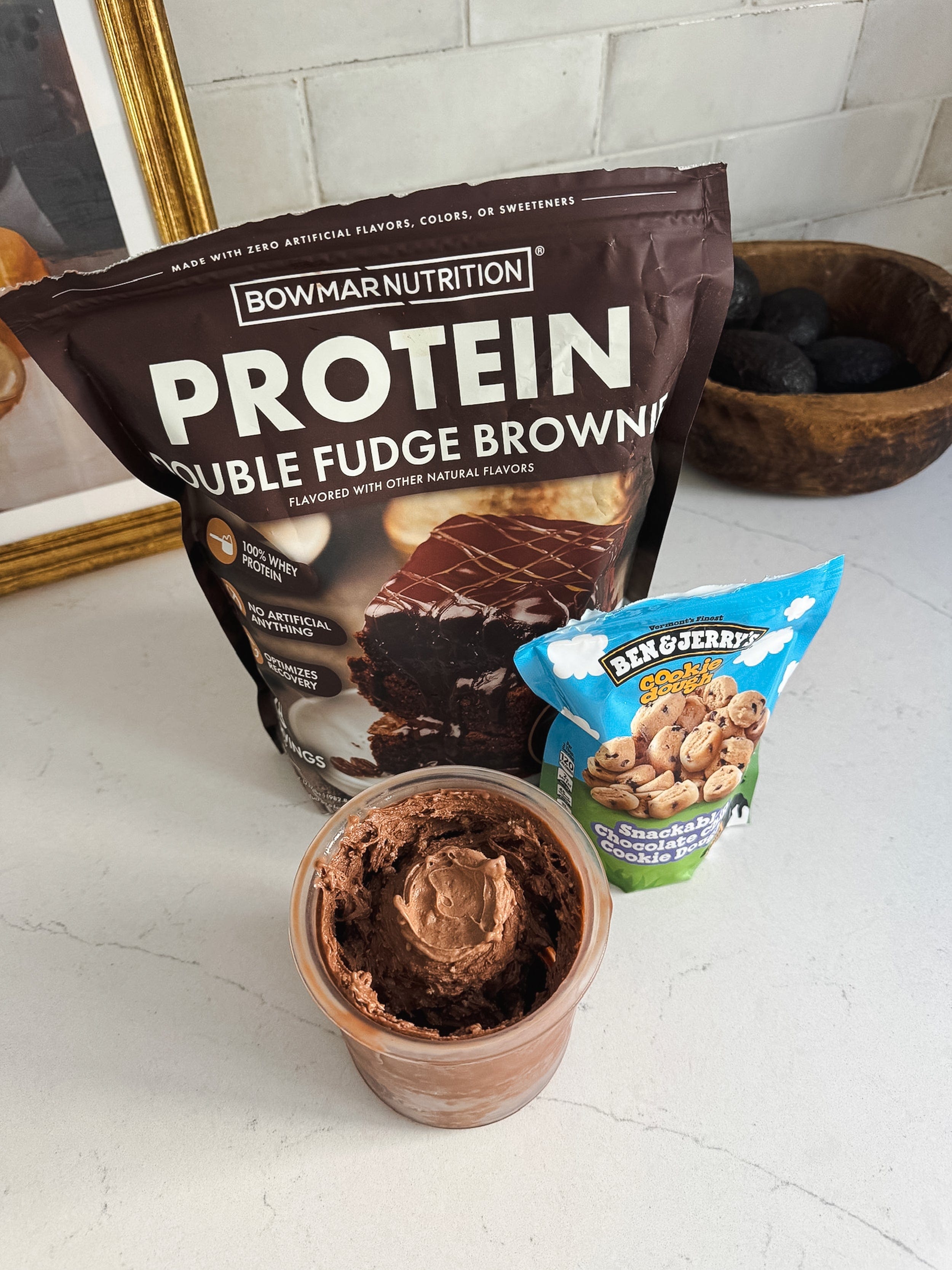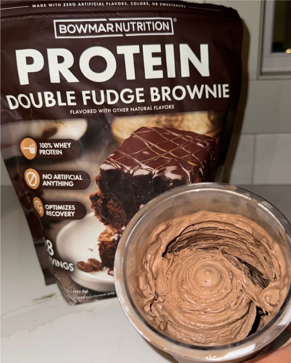 - 1 scoop Bowmar Nutrition Protein Double Fudge Brownie