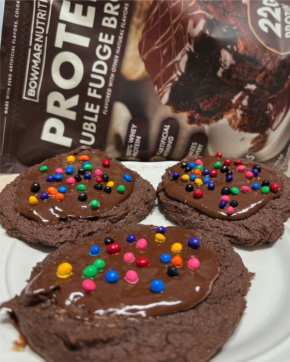 - 2 scoops Bowmar Nutrition Protein Double Fudge Brownie