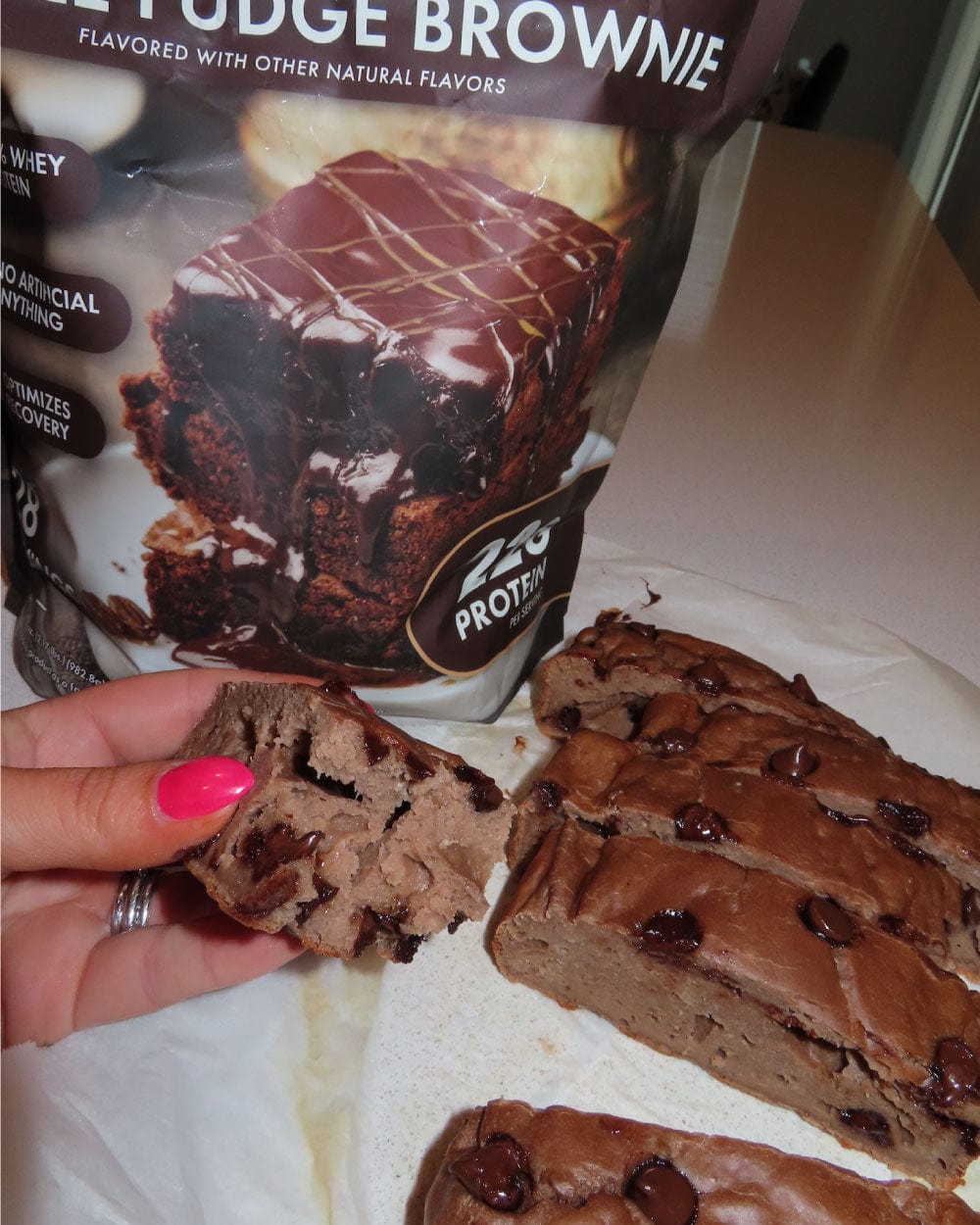 - Cut into slices and enjoy yourself some high protein brownie bread!