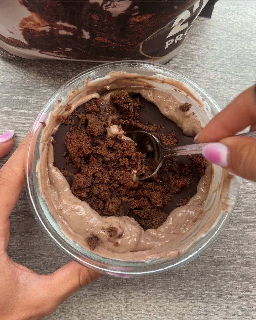 - In a small bowl, combine yogurt, protein powder, ¼ of the crumbled brownie.